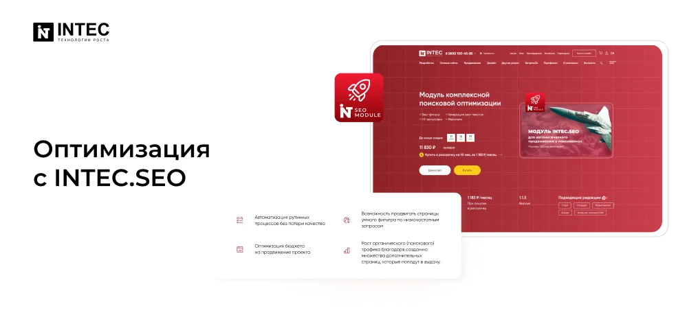 Грамотная поисковая оптимизация — один из ключевых факторов, которые определяют успех и востребованность любого сайта. Команда INTEC предлагает воспользоваться модулем INTEC.SEO, который содержит проверенные инструменты для улучшения SEO-показателей сайта.